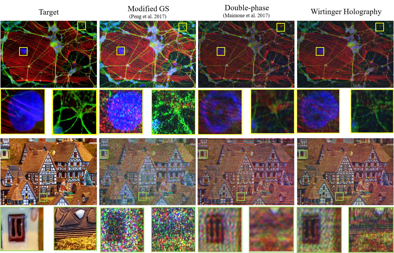 minimized with first-order optimization methods. The proposed Wirtinger Holography is flexible and facilitates the use of different loss functions, including learned perceptual losses parametrized by deep neural networks,