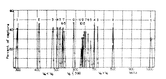 Well, in his talk, a few other things came out that were very interesting. One was that the percent-age of capture was always around 80%. The curves would come along like this as a function of voltage (Fig. 2). The curve would come along at about 80% and there would be a sharp peak up here and another sharp peak here and, well, all the peaks were about the same height.