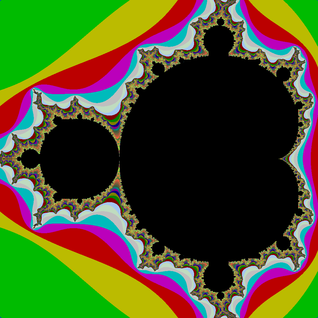 For the more dramatic color picture above, we replace the white points with color gradations, depending on the number of iterations needed to discover that the point is not in the set. These colors reveal the striking detail of the terrain just outside the Mandelbrot set.