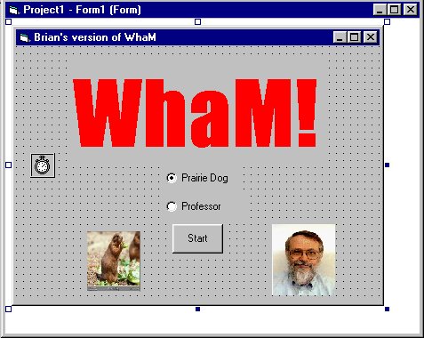 In WhaM, an image (in my case, of a small prairie dog like the one at the top of this page) jumps randomly around the screen. Your job is to hit the image with the mouse as fast as you can; after ten hits, your elapsed time is reported, and you get a chance to play again.