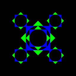 | Jay Qi My artistic creation plots four-pointed stars recursively. I made stars (diagonals vertical and horizontal) with alternating colors and new stars forming on the midpoint of the previous stars. I had it alternate the center points of the next order between the vertex and in the space between the tines. |