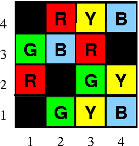 The robot can only occupy the colored squares. At each time step, the robot attempts to move up, down, left or right, where the choice of direction is made at random. If the robot attempts to move onto a black square, or to leave the confines of its world, its action has no effect and it does not move at all. The robot can only sense the color of the square it occupies. However, its sensors are only 90% accurate, meaning that 10% of the time, it perceives a random color rather than the true color of the currently occupied square. The robot begins each walk in a randomly chosen colored square.