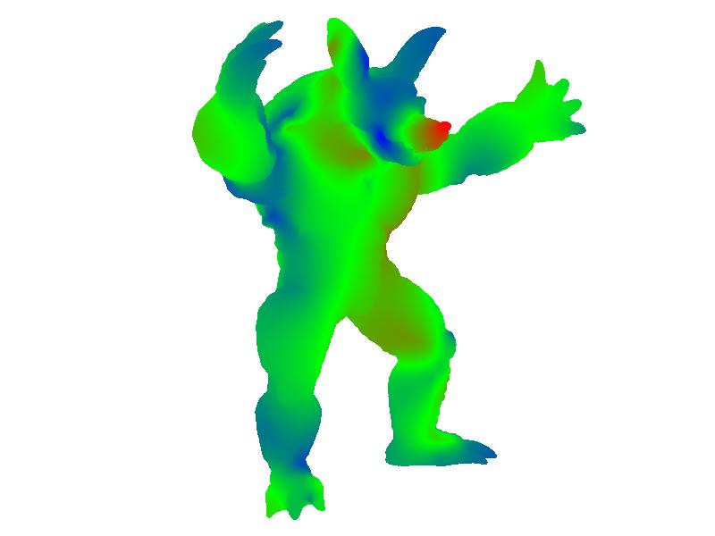 To evaluate surface function interpolation, I used a python script to randomly generate a sparse vector with 100 non-zero entries as the input function. Then the input function was loaded into my program and was interpolated. Here I demonstrate the interpolation result of armadillo and dragon.