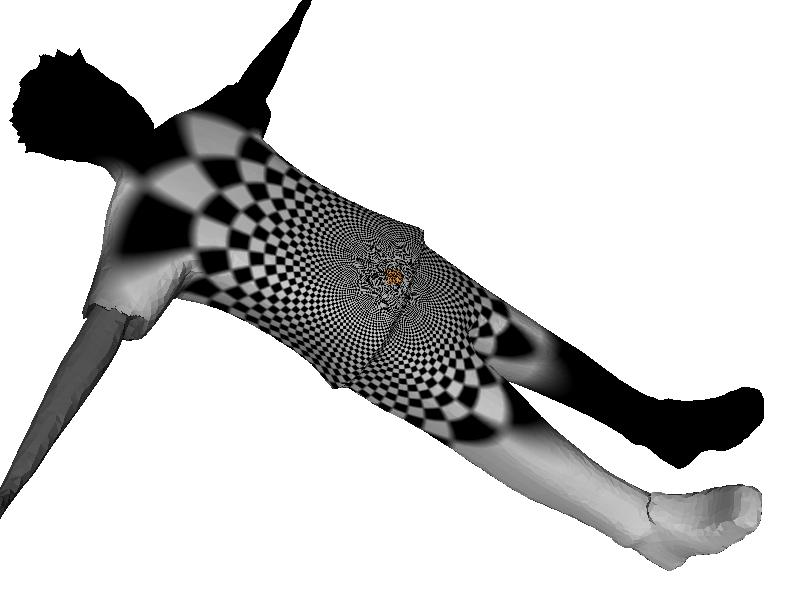 Uae the result of parameterization, to map checker boarder onto the mesh. Unfortunately, since parameterization given above is not an ideal one, it causes great distortion around the selected 'corner vertices'. The size of boxes vary greatly. Results are shown in Figure 16, 17, 18, 19, 20.