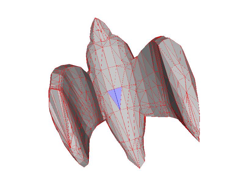 To parameterize the mesh, my program first asks the user to select one edge on the mesh. The edge will determine two adjacent triangles on the mesh. Then I set the coordinates for the 4 vertices to be corners of a unit square, force the laplacian of every vertex to zero, and solve the linear system. The solution will be completely on a plane, and inside the unit square. Every vertex's coordinate can be used as a uv coordinate for texture mapping.