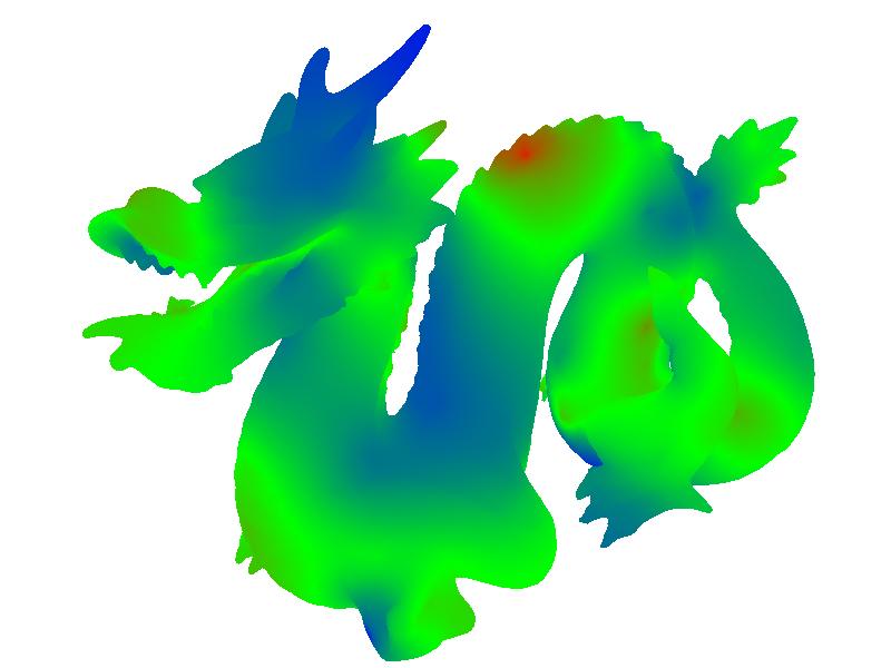 To evaluate surface function interpolation, I used a python script to randomly generate a sparse vector with 100 non-zero entries as the input function. Then the input function was loaded into my program and was interpolated. Here I demonstrate the interpolation result of armadillo and dragon.