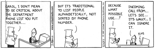 Unaccountably, the company that Carol and Dilbert and Wally work for has grown to 100,000 employees. Suppose your job is to take the standard, alphabetical company phone book and convert it into Carol's handy form, and then provide an algorithm that she or her computer could use to quickly look up the name corresponding to the incoming phone number. How would you do this? You can use an array N for the names and an array T for the telephone numbers, so that, e.g., if N[957] contained "Wally" then T[957] would contain Wally's phone number. (Careful: the number 957 is nobody's phone number--it's just the index into the two arrays.)