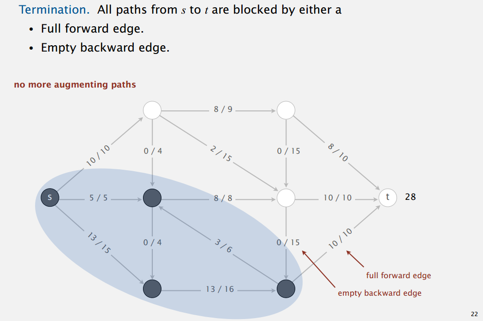 - That there are no more augmenting paths, because all the forward edges from s-t to are full, and all the backward edges from t-s are empty.