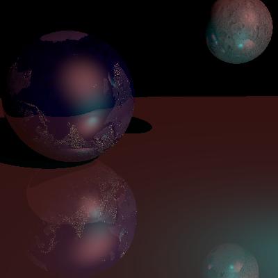 I wanted to play with texture mapping, and turns out it works nicely. Here represented is an earth on a reflective surface with a moon, blue point light, and a directional light.