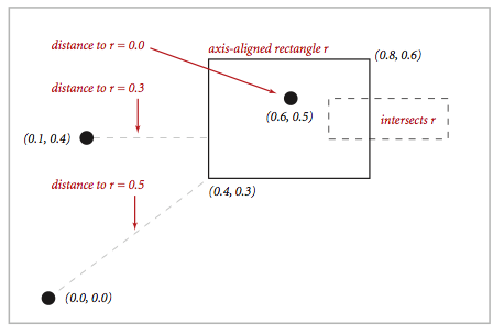 Use the immutable data type RectHV (part of algs4.jar) for axis-aligned rectanges. Here is the subset of its API that you may use: