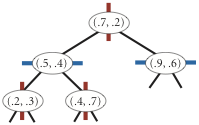 Create a symbol table data type whose keys are two-dimensional points. Use a 2d-tree to support efficient range search (find all of the points contained in a query rectangle) and nearest neighbor search (find a closest point to a query point). 2d-trees have numerous applications, ranging from classifying astronomical objects to computer animation to speeding up neural networks to mining data to image retrieval.