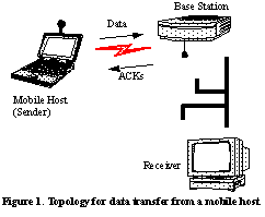 It might be tempting to come to the conclusion that a protocol very similar to the snoop protocol described in See . Background and [7] for data transfer to the mobile host can be used in this case as well. In particular, one of the important features of that case was that it required changes only to the base station and not to any other entities in the network. However, it is unlikely, if not impossible, that a protocol with modifications made only at the base station can substantially improve the end-to-end performance of reliable bulk data transfers from the mobile host to other hosts on the network, while preserving the precise semantics of TCP ACKs. For example, caching packets at the base station and retransmitting them as necessary is not useful, since most of the packet losses will be from the mobile host to the base station. Running a Snoop agent at the mobile host will be inappropriate because the same duplicate ACKs signify both corruption and congestion losses. There is no way for the mobile sender to know if the loss of a packet happened on the wireless link or elsewhere in the network due to congestion.