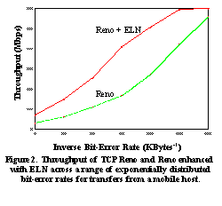 We performed several experiments to measure the performance of data transfer from the MH to the FH. These results, measured across a range of exponentially-distributed bit-error rates, are shown in See Throughput of TCP Reno and Reno enhanced with ELN across a range of exponentially distributed bit-error rates for transfers from a mobile host. . As before, there are significant performance benefits of using the snoop protocol coupled with the ELN mechanism in this situation. These measurements were made for wide-area transfers between UC Berkeley and IBM Watson, across one wireless WaveLAN hop and 16 Internet hops. At medium to high error rates, the performance improvement due to ELN is roughly a factor of 2. At lower error rates, TCP Reno performs quite well as expected, and the benefits of ELN are not as pronounced. The main advantage of ELN is that it helps maintain a large TCP congestion window even when wireless error rates are high, reacting only to congestion.