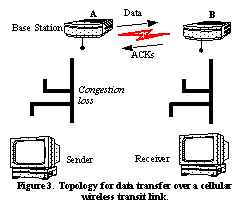 The ELN-based approach presented above for improving end-to-end performance also generalizes to cellular wireless transit links where the TCP ACKs traverse the same base stations as the data packets on the forward path. Consider a connection over one cellular wireless transit link and other wired links, as shown in See Topology for data transfer over a cellular wireless transit link. . Suppose a loss happened due to corruption over the wireless link. In this case, the agent at base station A would have seen the packet, while B would not, so the packet gets added to B's list of holes using the same algorithms as in See Using Explicit Loss Notifications . When duplicate ACKs arrive for the missing packet at B, its agent sets the ELN information bit and propagates it towards A. Since A originally saw the packet (it is not in its list of holes), it infers that the packet was obviously lost over the wireless link and simply lets the ACK go through to the data sender with the ELN information set on it. Of course, it is possible to deploy a snoop agent that caches and locally retransmits packets at A in this topology. In this case, the agent also suppresses duplicate ACKs for corrupted packets, as described earlier. It is important to note that local retransmissions from the snoop agent at A now happen only upon duplicate ACKs with ELN set.