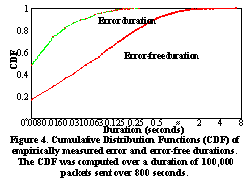 We performed eight separate experiments using this approach, with N = 100,000 packets in each experiment, packet size S = 8000 bits and R = 1 Mbps. The resulting error and error-free temporal distributions are shown in See Cumulative Distribution Functions (CDF) of empirically measured error and error-free durations. The CDF was computed over a duration of 100,000 packets sent over 800 seconds. . In the experiments that follow, we picked one of these data sets. In this data set, 10,591 packets were lost due to wireless errors, a gross loss rate of 10.6%. While this might seem high, it is in fact quite representative of the quality of the outdoor wireless links in the Reinas network. The typical loss rates in the network vary from 1% to over 30%, depending on external factors and environmental conditions.
