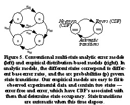 The cumulative distribution functions (CDF) of error and error-free durations are used to generate bit errors in the following manner. There are two linked states, corresponding to the error-free and error durations, that the error model transitions between. It starts in the error-free state where no errors occur, and stays there for an amount of time determined by a lookup into the corresponding CDF. After this time has elapsed, there is an automatic transition to the error state, where all incoming packets are corrupted. The amount of time spent in this state is, as before, determined by the corresponding CDF. Thus, this empirical error model shown in See Conventional multi-state analytic error models (left) and empirical distribution-based models (right). In analytic models, the different states correspond to different base error rates, and the arc probabilities (p) govern state transitions. Our empirical models are easy to fit to observed experimental data and contain two states -- error-free and error, which have CDF's associated with them that determine state occupancy. State transitions are automatic when this time elapses. is a two-state Markov chain, but is quite different from the analytic models. Here, the states themselves correspond to time, with automatic state transitions. The analytic models are richer in that each state has a different base error rate, with explicit transition probabilities between states. However, it is hard to reconcile experimental data to meaningful parameters that can be used in these models.
