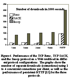 We conducted experiments using TCP Reno, TCP SACK and the Snoop protocol using the Web workload, varying the number of concurrent TCP connections from 1 to 4, as well as using persistent-HTTP [12]. The results of these experiments are shown in See Performance of the TCP Reno, TCP SACK, and the Snoop protocol on a Web workload in different protocol configurations. The graphs show the number of separate downloads (connections) using 1 to 4 concurrent connections per client, as well as the performance of persistent-HTTP [12] for the three protocols. , which depicts the number of successfully completed individual downloads (connections) in 1000 seconds. We see that the performance of the Snoop protocol is between three and six times better than the other protocols. We also note that the P-HTTP performance does not account for user think times between successive downloads, and is hence an optimistic upper bound on the performance achievable in practice.