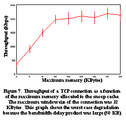 We answer this question by varying the amount of per-connection cache memory at the base station, and by measuring the performance of the Snoop protocol for bulk TCP transfers as a function of the amount of cache memory. The results of this experiment, performed on 1KB sized packets, is shown in See Throughput of a TCP connection as a function of the maximum memory allocated to the snoop cache. The maximum window size of the connection was 32 KBytes. This graph shows the worst-case degradation because the bandwidth-delay product was large (50 KB). . We see that the performance linearly increases with cache memory until it plateaus off at the maximum value when the cache size reaches a certain threshold value. This value is equal to the "effective" window size for the connection. We note that this curve highlights the worst-case performance degradation because the bandwidth-delay product of the connection is large (50 KB).