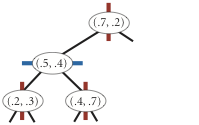 The prime advantage of a 2d-tree over a BST is that it supports efficient implementation of range search and nearest-neighbor search. Each node corresponds to an axis-aligned rectangle, which encloses all of the points in its subtree. The root corresponds to the entire plane [(−∞, −∞), (+∞, +∞ )]; the left and right children of the root correspond to the two rectangles split by the x-coordinate of the point at the root; and so forth.