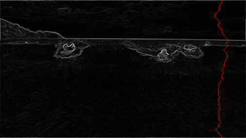 The energy is high (white) for pixels in the image where there is a rapid color gradient (such as the boundary between the sea and sky and the boundary between the surfing Josh Hug on the left and the ocean behind him). The seam-carving technique avoids removing such high-energy pixels.