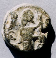 reverse: figure stg. r., head turned l., holding uncertain objects; ram at lower left. Possibly depicts Abraham holding knife, an angel in the background stopping the sacrifice of Isaac, and Isaac seated at lower r. with his back to the viewer.