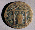 reverse: distyle temple with spherical object in pediment; within, simulacrum of Pergaean Artemis between star l. and crescent r.